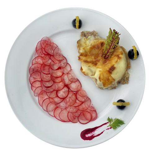 Gratin de viande hachée et canapé de radis confits